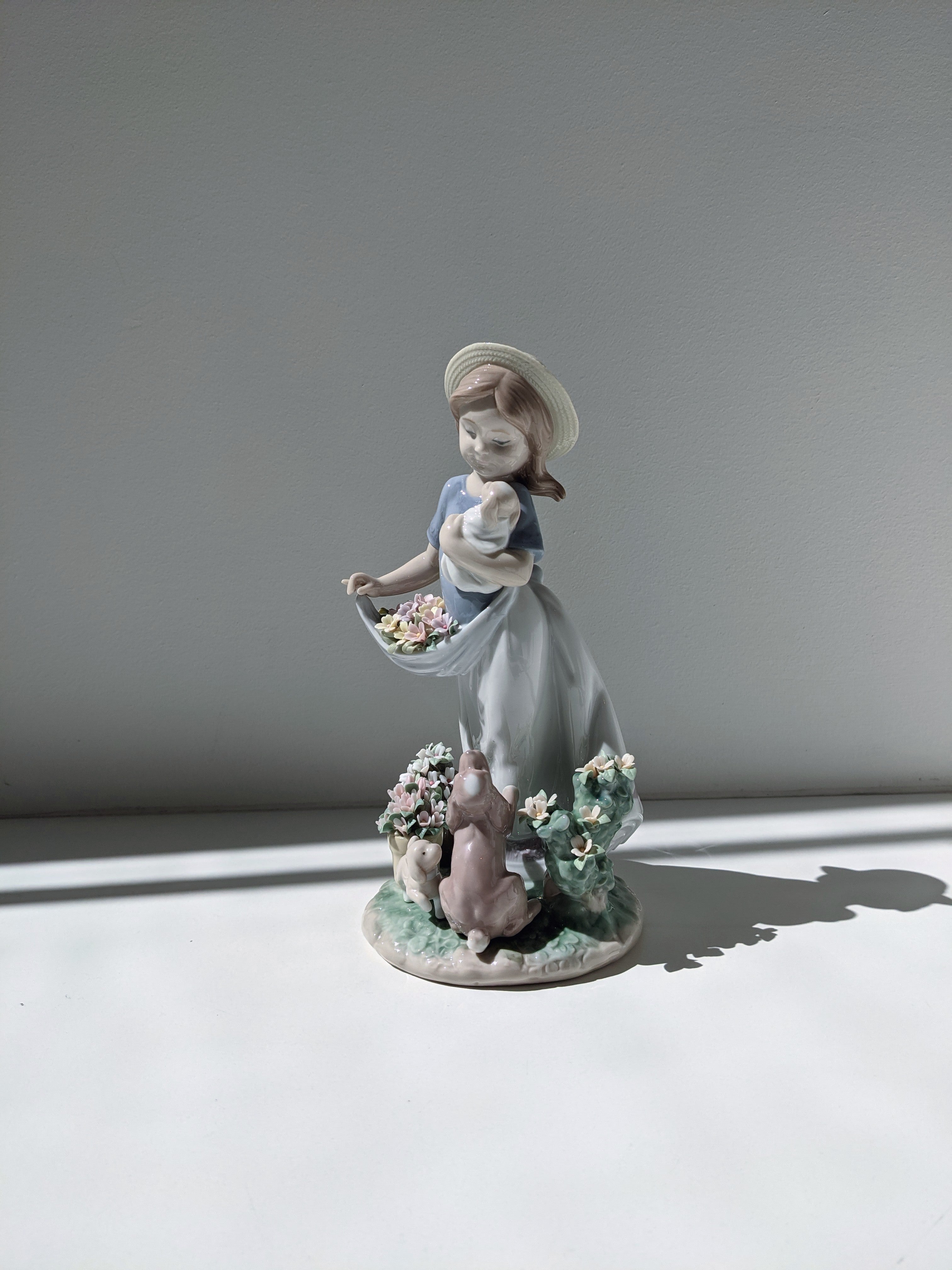 A girl romps through the garden with her lovable puppy in her embrace and a skirt full of Lladró signature handmade porcelain flowers, made petal by petal. Two puppies are by her feet, calling for her attention.
