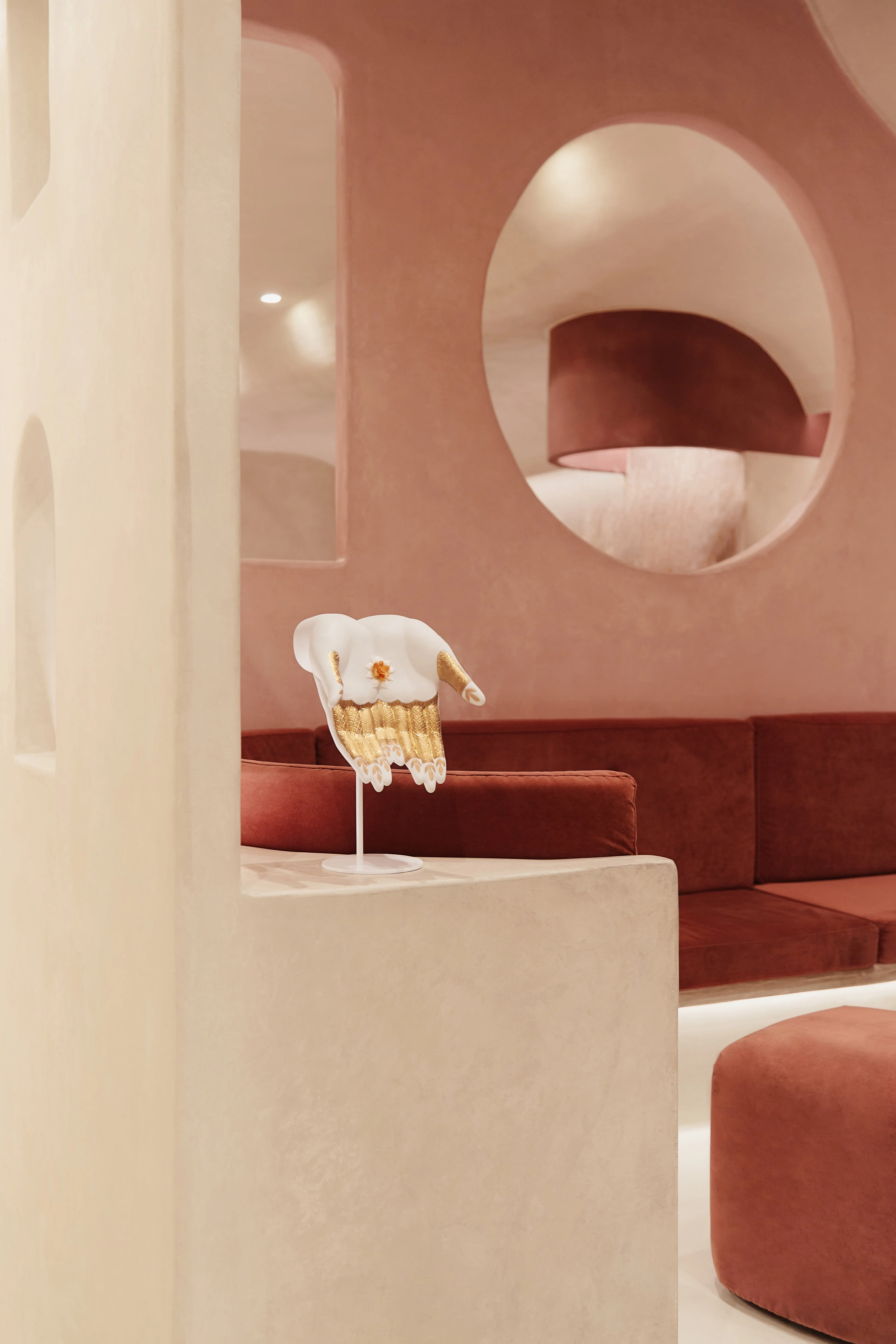 In this particular version, the hand is decorated with geometric patterns and plant motifs that are meticulously etched on the fingers. A sculpted flower rests on the hands with delicate petals handmade one by one. Different tones of golden lustre were used in the decoration of the etchings, some with a glazed finish and other matt. Meanwhile, the flower, handmade petal by petal, is decorated in a tone that combines yellow, pink and a subtle hint of gold. Abundance Mudra celebrates the wealth of life, the gifts it showers us with. And gratitude for all that life gives us.