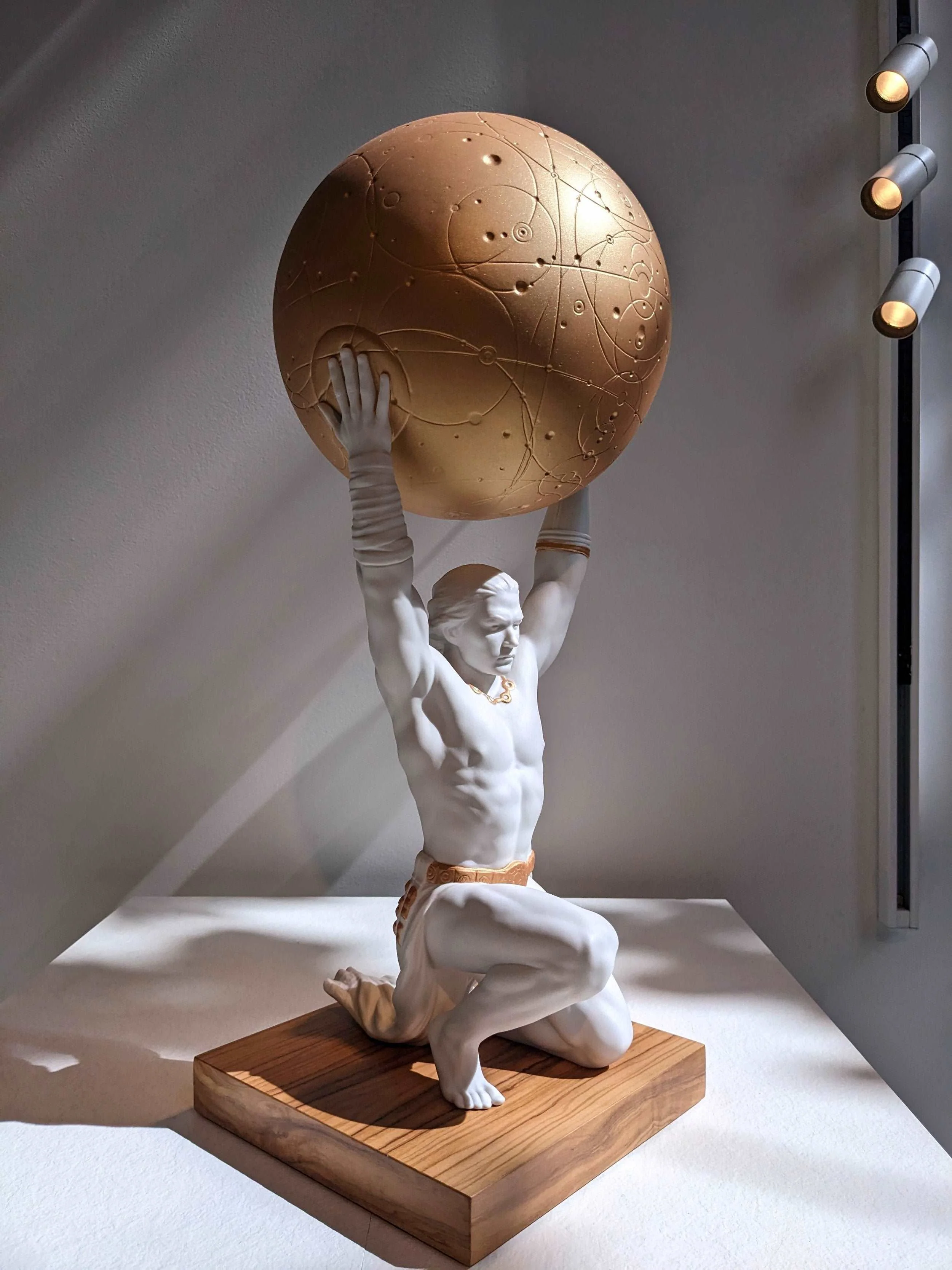 The Greek Titan Atlas made from matt white porcelain, shown holding up the cosmos in Lladró's signature gold lustre. Buy it now at Lladró Sydney, Australia.