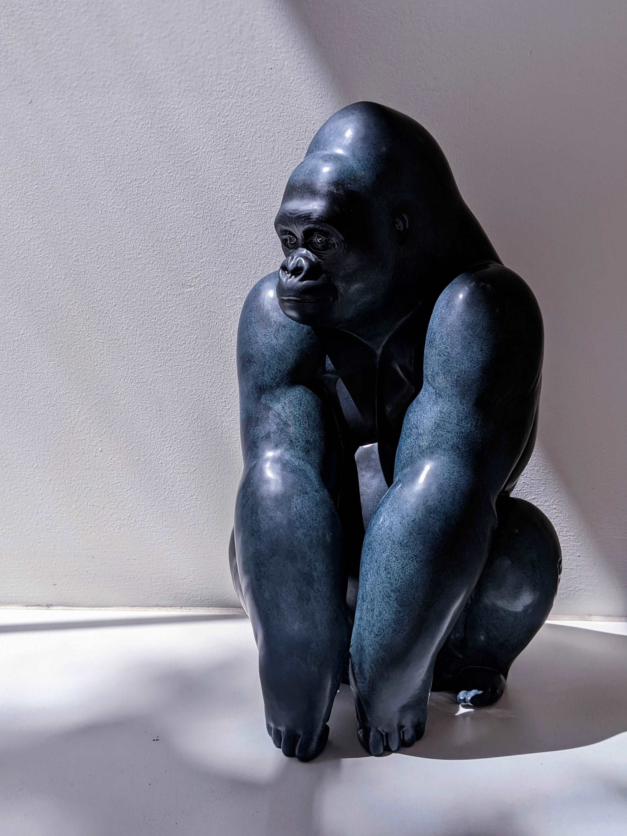 A stoic black gorilla is seated and observing its surroundings in this porcelain sculpture made using stoneware finishing.