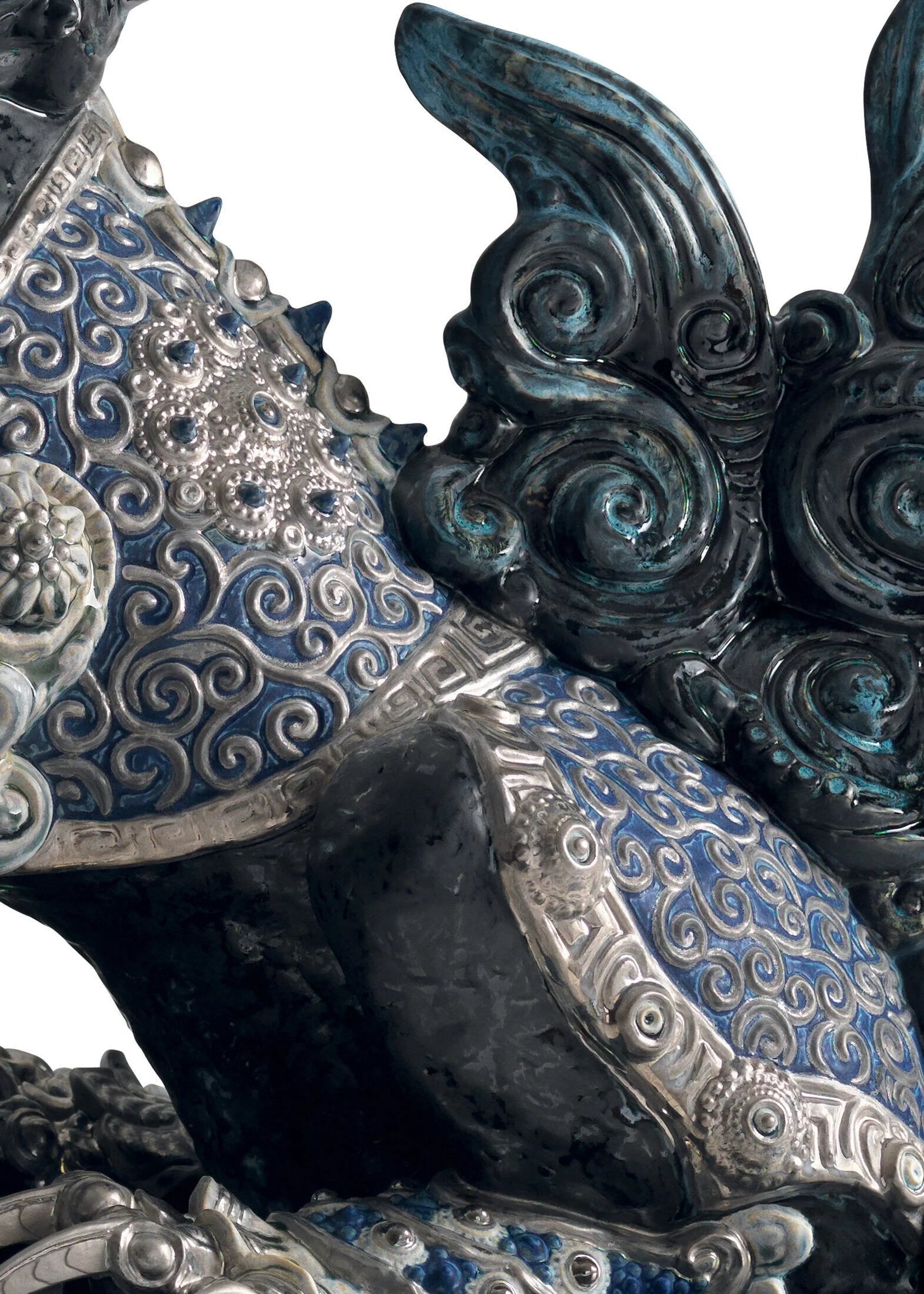 This lioness is paired with the guardian lion (black) and there are two other decorative versions. Black, blue and silver tones are predominant in its ornamentation, giving the piece a very modern air. Artists of the High Porcelain workshop recreate and embellish every detail of the piece, such as the elaborate ornamentation of the skirts and chest plates, the introduction of the necklace as a decorative element and the lavish modelling of the manes and tails. Authentic filigree work makes these impressive sculptures a work halfway between the thousand-year-old tradition and the maker´s creation.