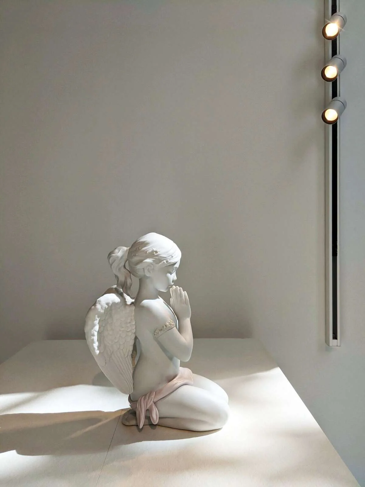 White matt porcelain figurine of an angel in the form of a girl praying and touches of soft colours and ornamentation. Buy it now at Lladró Sydney, Australia.