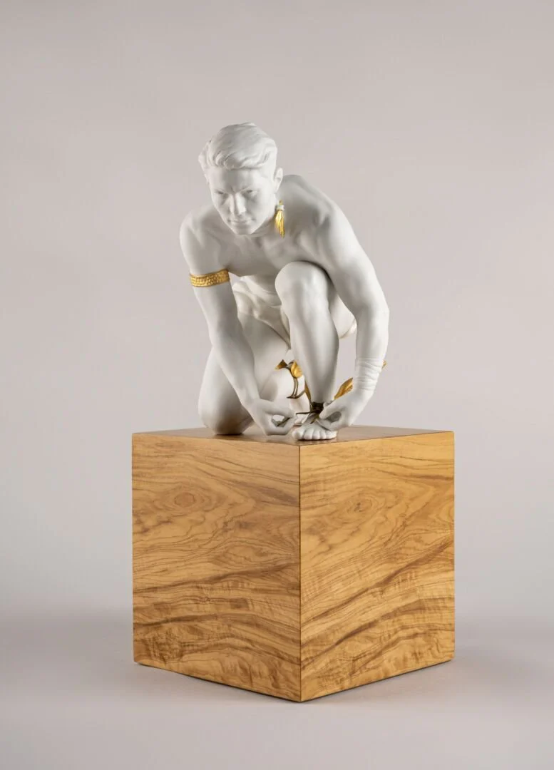 The God Hermes from Greek Mythology in matt porcelain, equipped with his winged slippers, in 24-karat gold lustre. Buy it now at Lladró Sydney, Australia.