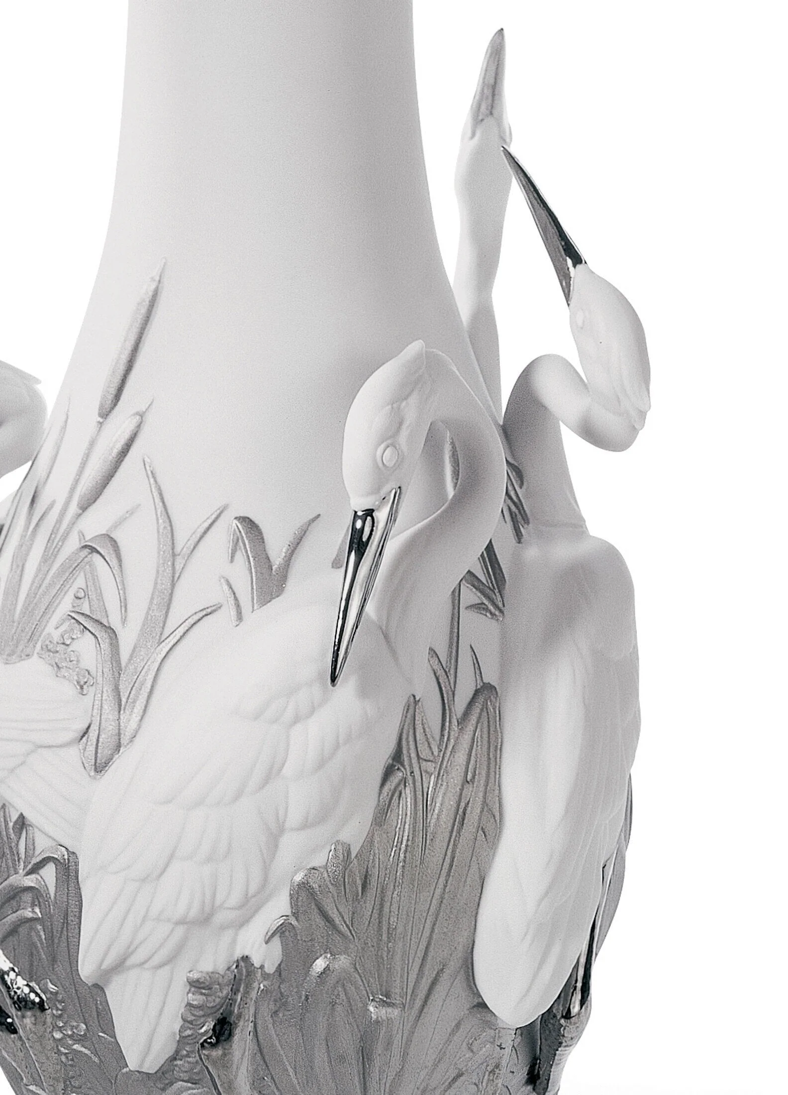 White handmade porcelain vase in matt white with sculptural herons decorated with glossy and matt silver lustre. Buy it now at Lladró Sydney, Australia.
