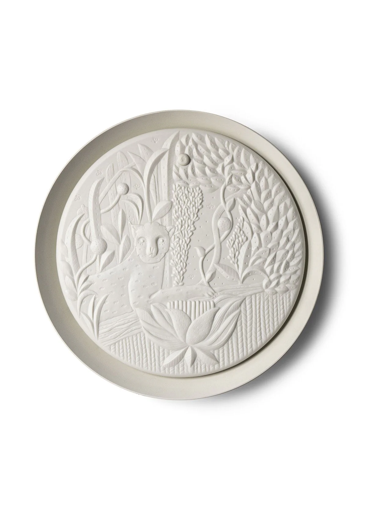 This handcrafted Lladró wall lamp features a relief inspired by wildlife, a feline and a variety of tropical plants. Buy it now at Lladró Sydney, Australia.