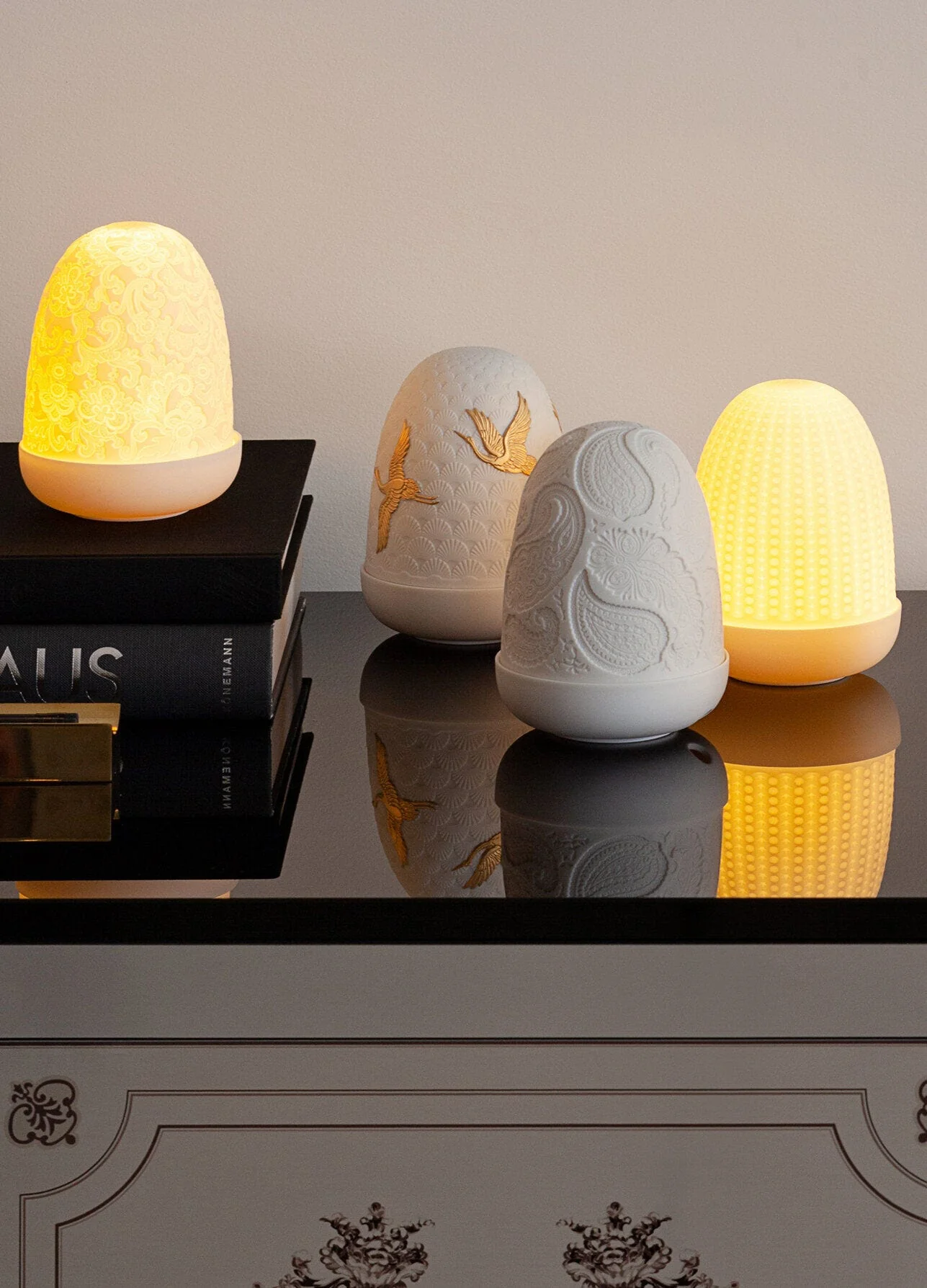 Lladró cordless table lamp made of translucent matt white porcelain with lace embroidery motifs. Buy it now at Lladró Sydney, Australia.
